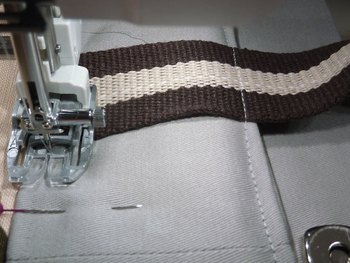 - Edgestitch around the top of the band through all the layers. Remember to make sure the handles are up in position as this is the seam that secures them in their upright position. Also make sure the shoulder strap is pulled up and away from the seam.