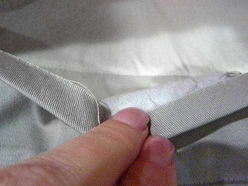 - Edgestitch along the inner fold of the binding tape through all the layers. Go slowly and carefully to insure you are catching both sides of the tape in this one seam. If your machine has the ability to adjust the needle position, use that feature to move your needle all the way to left to allow you to get as close as possible to the seam line.