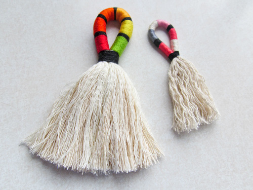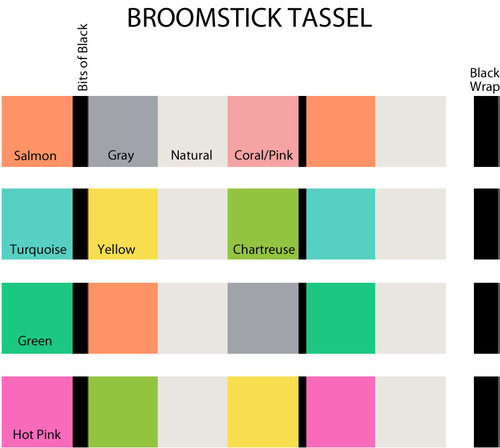 - Large Broomstick Tassel: ½” natural cord, 12″ length of cord, 4″ center of wrapped colors, 6″ in finished length