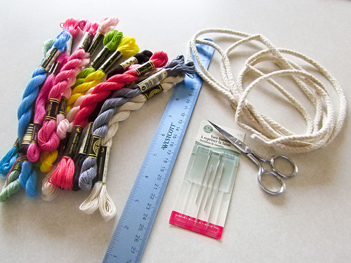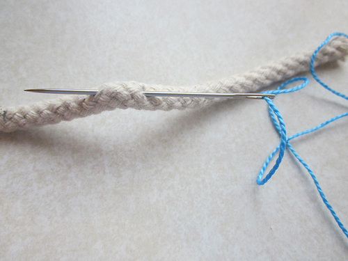 - Cut a 30” length of pearl cotton in your starting color. Thread the floss through a yarn needle and make a stitch into the cord.