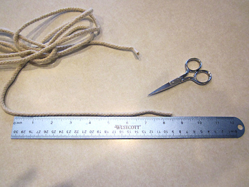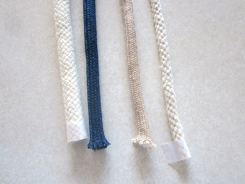 - The photo below shows a variety of cords that would work well for this technique; all of these were found at a local JOANN Fabrics. From left to right they are: Natural ½” braided cord, ¼” navy blue drawstring cord, ¼” natural knit cord, and ¼” beige drawstring cord. The natural knit cord is a bit of a misnomer since it is actually loosely woven over an inner core of threads, and so can be easily unraveled to create a tassel.