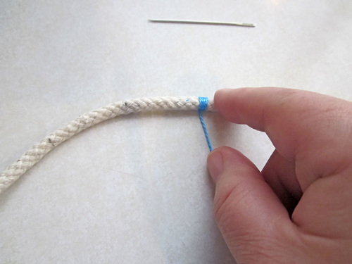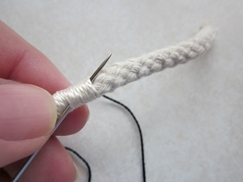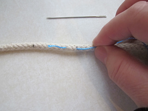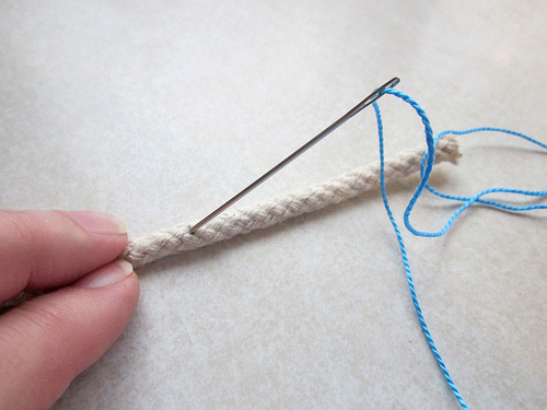 - Slide off the needle and pull the thread through until it is hidden within the cord.