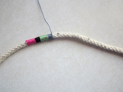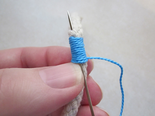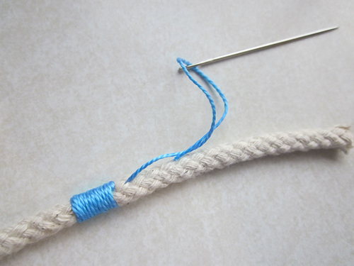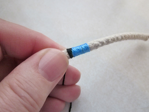 - Start wrapping the cord with the pearl cotton. You are wrapping up towards the center of the cord. Wrap tightly; there should be no cord showing between the wraps.