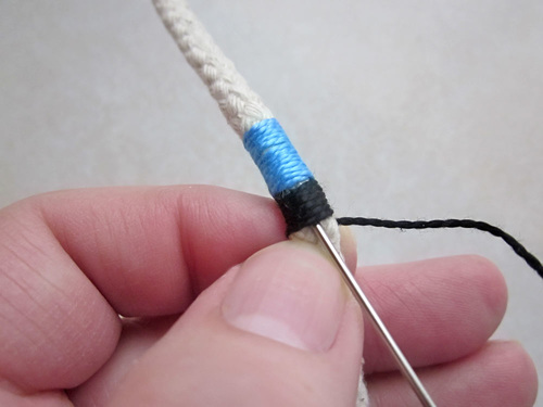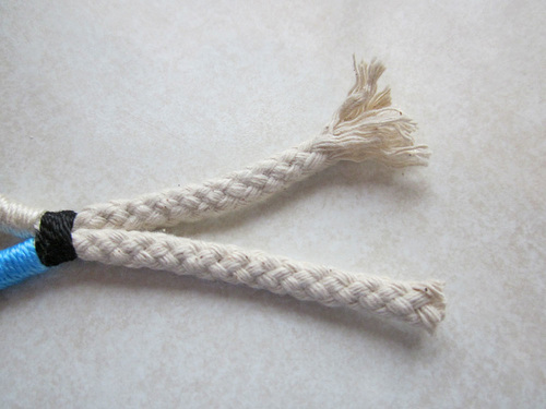 - Pull the needle through the cord coming out just below the wrapped section. Trim the floss close to the cord. A slight tug on the cord will allow the thread end to disappear into the cord.