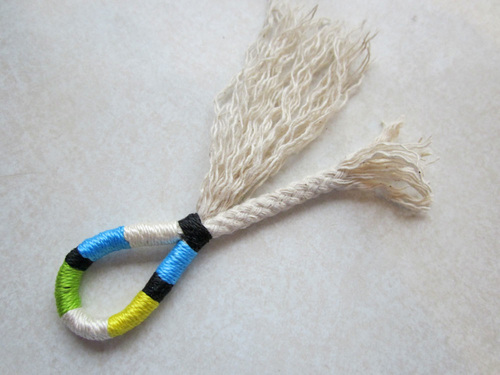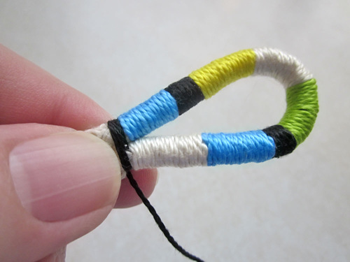 - Start the next color by anchoring it with a stitch and then wrapping the thread first through the ring with about eight wraps. Once the ring feels secure, continue wrapping the thread around cord to finish that color section. Finish the tassel in the same manner as above.