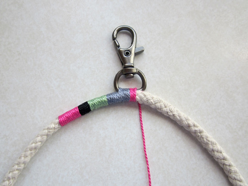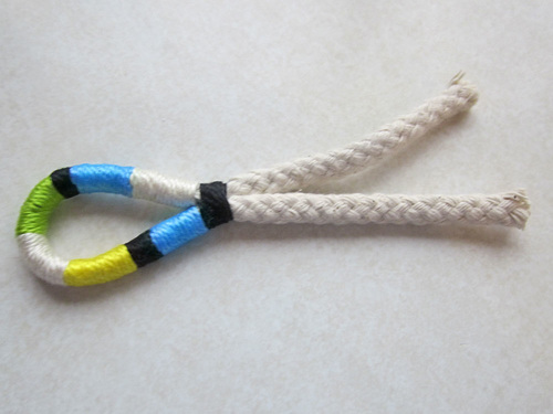 - Wrap the thread through the hardware to fill the space, probably with up to 14-16 wraps. You can even change colors at the mid-point, which is a nice look within the wider opening.