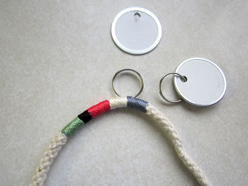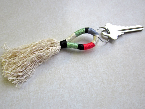 - Our sample shows a ¾” split ring, such as what you find on key tags. The tassel is made in the same way, anchoring the thread and wrapping the cord. Stop the wrap ⅛” from the mid-point mark.