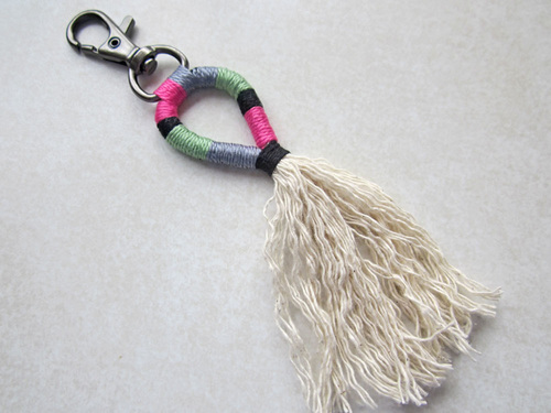 - The large center loop of the completed broomstick tassel allows you to easily attach it to a variety of projects. However, you can also add a split ring, D-ring or swivel hook, incorporating it into the thread wraps.