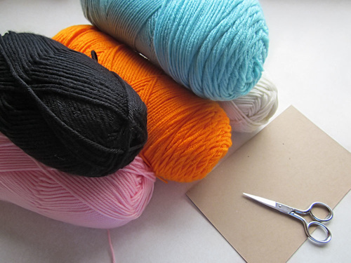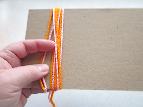 - Find the original two colors for the yarn body. Again feeding both colors from their skeins together, wrap the colors around the 5″ side of the cardboard approximately 20 times.