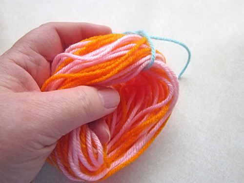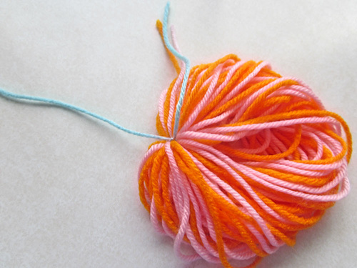 - Cut an approximate 8” length of the third color of yarn and tie it around all the loops.