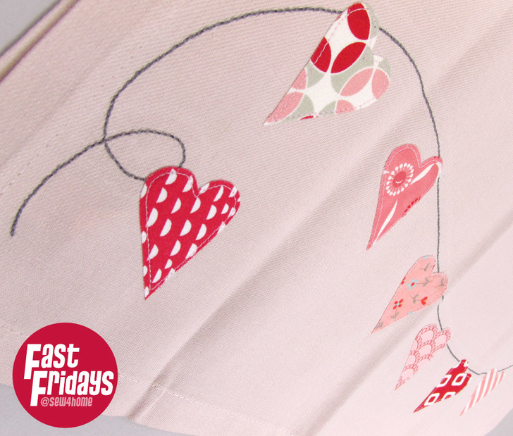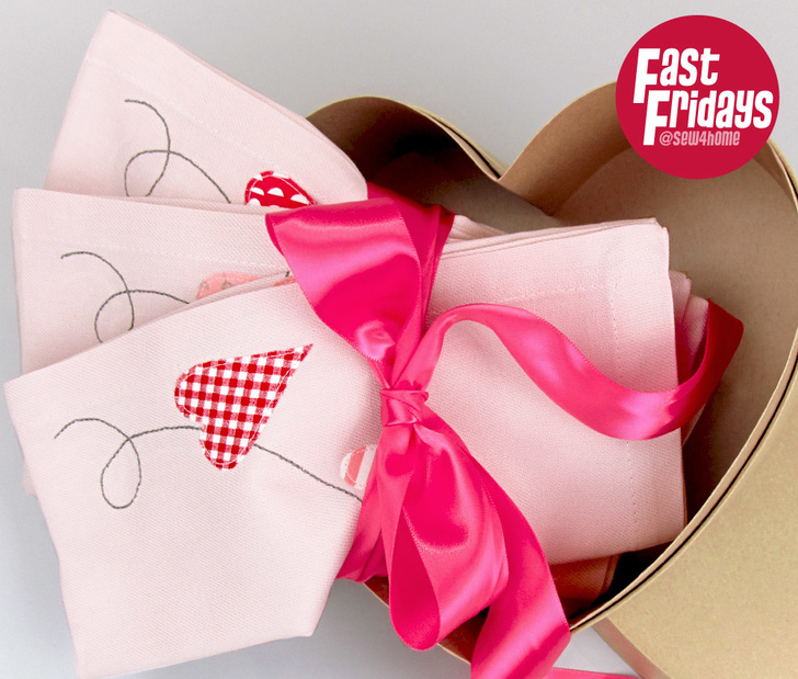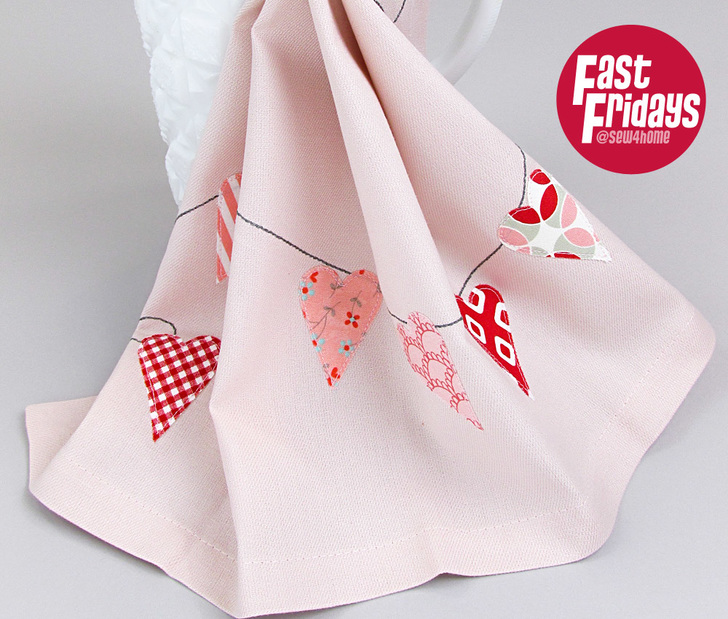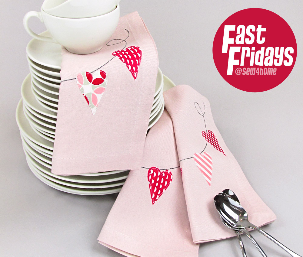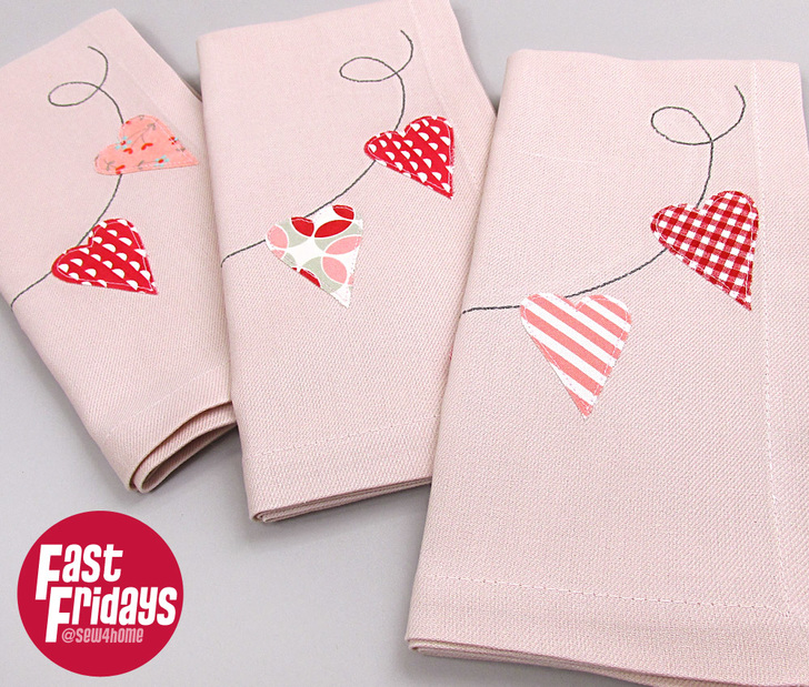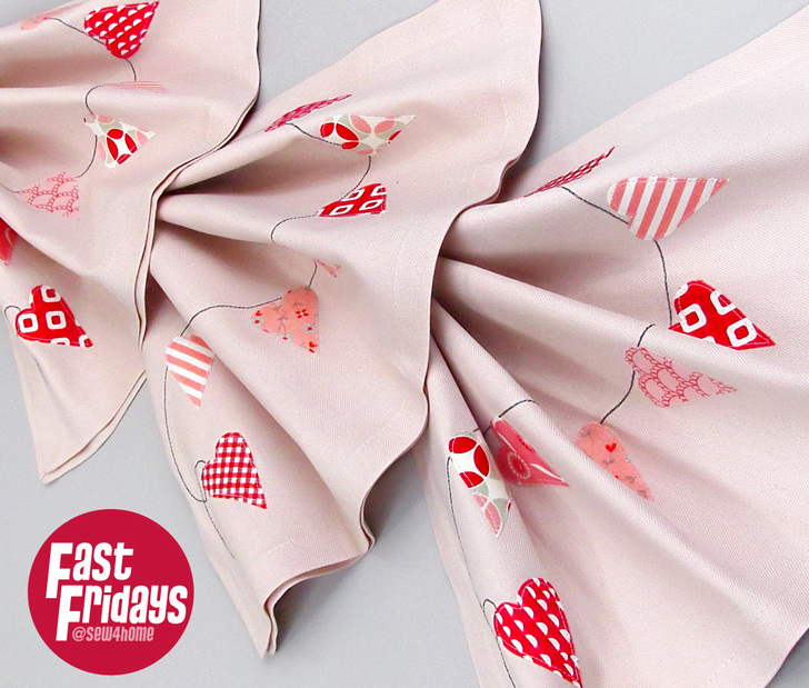When you’re full of love, let it show! We’re hanging our hearts on a curlicue clothesline for everyone to see. The S4H Fast Fridays series is all about whipping out something wonderful in no time at all. When you start with a set of purchased napkins, all that’s left is the easy appliqué. We show you a clever trace and stitch technique that will make quick work of one, two, three or a table full of napkins.