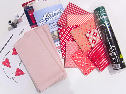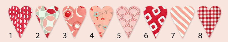 - Scraps of coordinating quilting weight cottons for the exterior; we used 8 assorted fabrics in pinks and reds – petite motifs are the best so the pattern shows up well within the small hearts