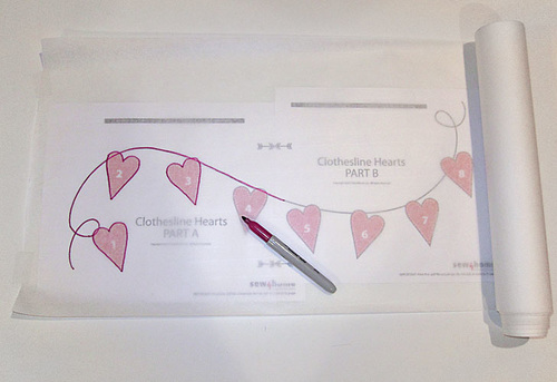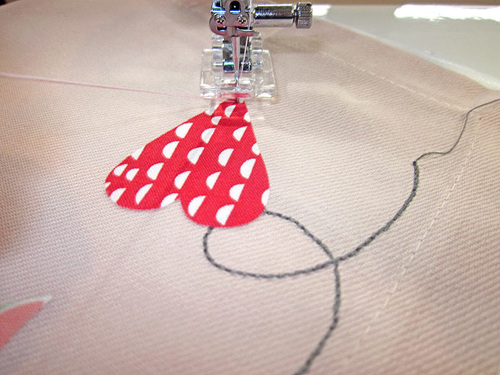There’s a template to download below that you’ll use to trace the clothesline and well as the position of each of the eight little hearts. The clothesline itself is done with a simple utility Triple Stitch; we used a heavier 28wt Aurifil thread in the top and bobbin to give the line extra density.