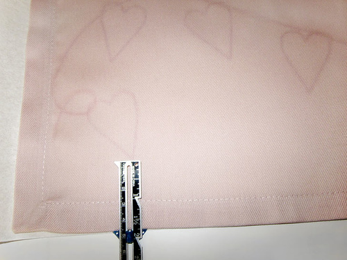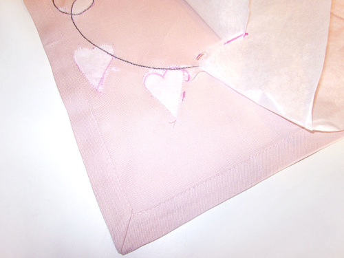 - Place the napkin right side up over the stabilizer, positioning the napkin so the point of the first heart outline on the far right is 1¾” up from the lower edge of the napkin. Center the design between the napkin’s side hems. Pin the napkin to the stabilizer.