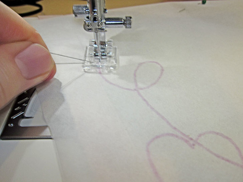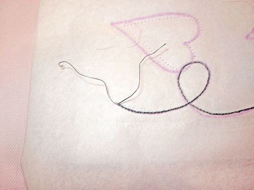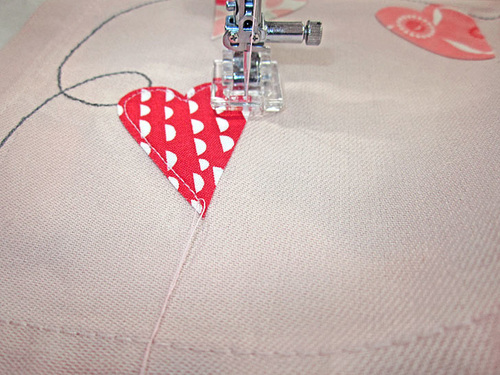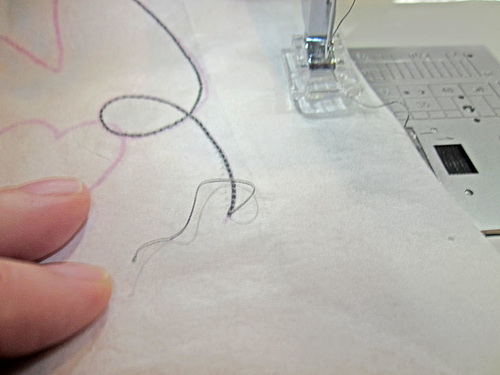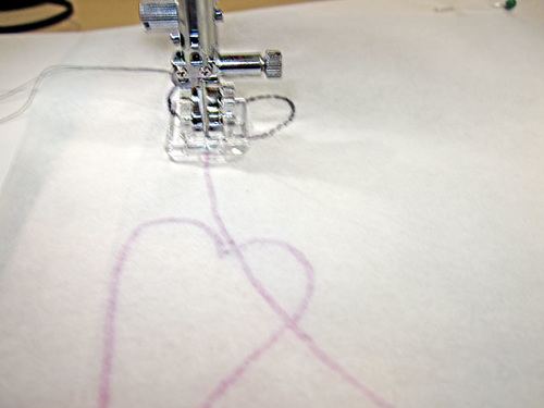 - Re-thread the machine with standard thread in the top and bobbin. Slightly lengthen the stitch. Drop the needle into the point of a heart.