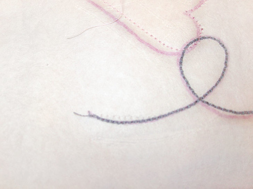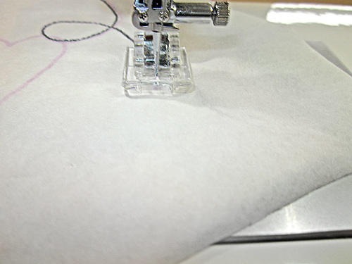 - Start stitching slowly, carefully following the drawn line. On the tight curves, it may be necessary to stop, with the needle down, in order to lift the foot and pivot a bit for the next stitch.