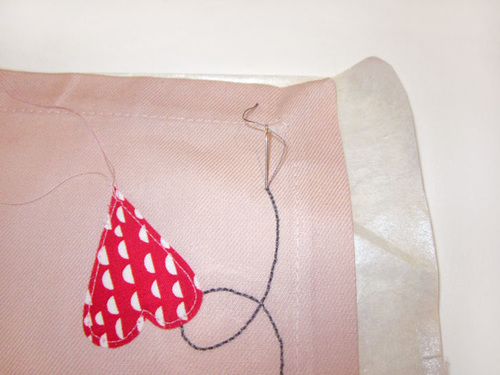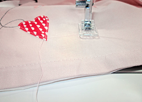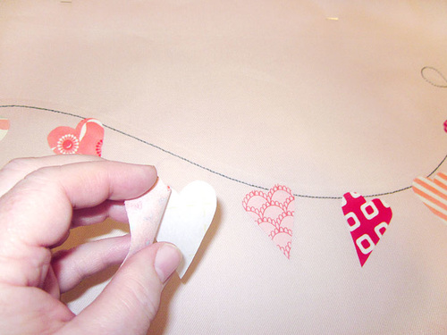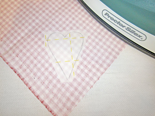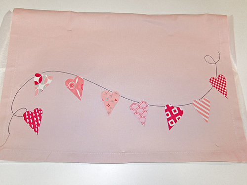 The hearts are adhered with raw edged appliqué, the easiest of the standard appliqué techniques. After multiple laundering, the edges of the hearts may start to slightly fray, which could give them the perfect shabby chic appeal. That said, with their small shape and because the fusible web holding the the hearts in place goes all the way to edge, any fraying is likely to be minimal.