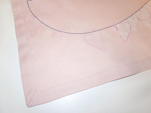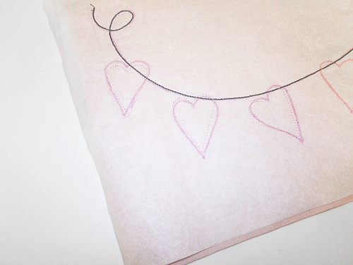 Our Clothesline o’ Hearts stretches across almost the full width of the standard 20” x 20” store-bought napkins we used. You could certainly make your own napkins on which to appliqué. If this is your choice, shoot for the same finished size for the best fit with our template. Your hem should finish at no more than ¾” in width all around. We also recommend a base fabric that is somewhat see-through in order for the trace and stitch technique to work well.