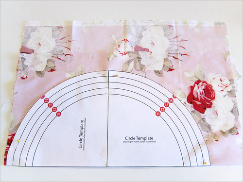 - Fold the fabric circle into quarters and mark each fold with a pin. This will give you quarter points around the circle, like the points of a clock at 12:00, 3:00, 6:00, and 9:00.