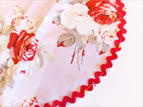 - Position and pin the rick rack around the perimeter. The top waves of the rick rack should be flush with the raw edge of the circle. The ends of the rick rack can simply overlap as shown in the photo below.