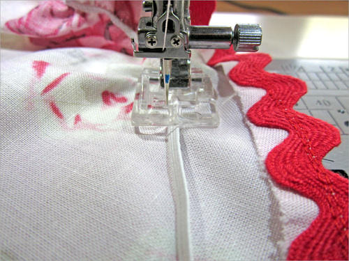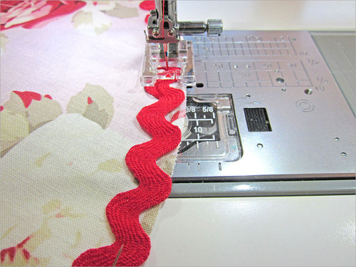 - Stitch the rick rack in place down the exact center. We used the Janome Satin Stitch foot, which is clear and has a great little red arrow at the front of the foot that makes it easy to keep your stitching straight.