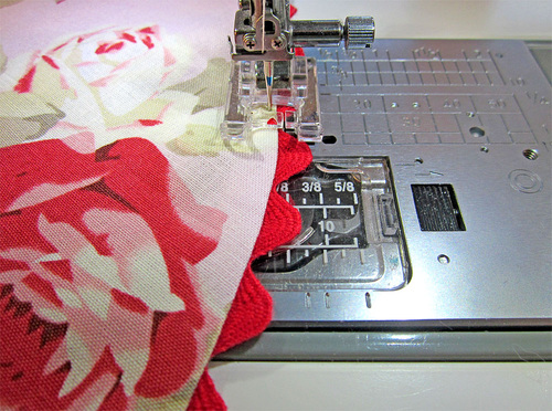 - If necessary, re-thread the machine with thread to match the fabric in the top. The bobbin thread should still match the rick rack. Topstitch the hem in place all around, running the seam close to the folded edge. We’re still using our Janome Satin Stitch foot for a smooth stitch line.