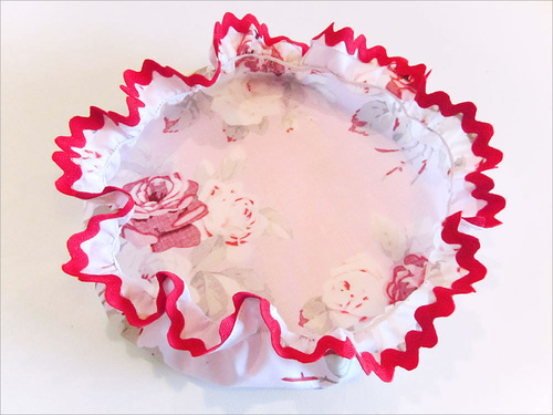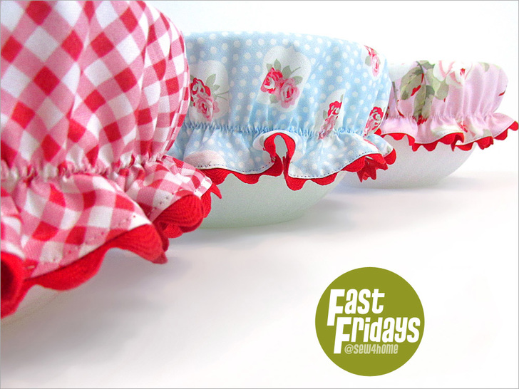 The size of each bowl cover will vary based on the size of the bowl you wish to cover. Ours were approximate 5″, 7″ and 9″ in diameter across the top with a 3″ ruffled drop all around.