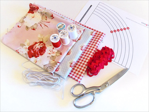 We used fat quarters for our samples, but any larger scraps would work well. A length of coordinating rick rack and some tiny elastic are the only additional supplies.