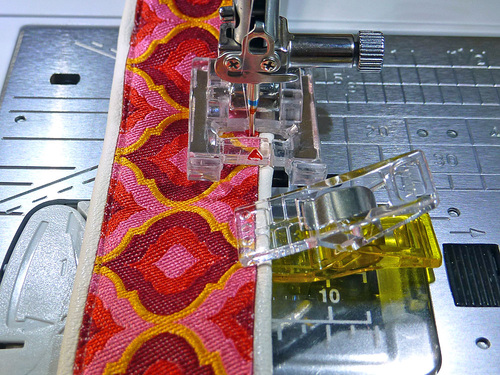 NOTE: If you are new to working with monofilament, for best results, you may need to loosen your upper tension slightly. It’s also a good idea to lengthen your stitch and sew at a slow and even pace. This type of thread does not stretch as well as regular thread and can break more easily under pressure, especially if it accidentally slides off the spool and wraps around the spool pin. Using a spool cap against the spool helps hold it in place on the pin, and again, going slowly and evenly helps the thread to feed correctly off the spool. Finally, always sew in the same direction along both sides of the ribbon. This will help prevent any shifting and puckering. - Edgestitch along both both sides through all the layers. Stitch slowly and carefully removing the clips as you go.