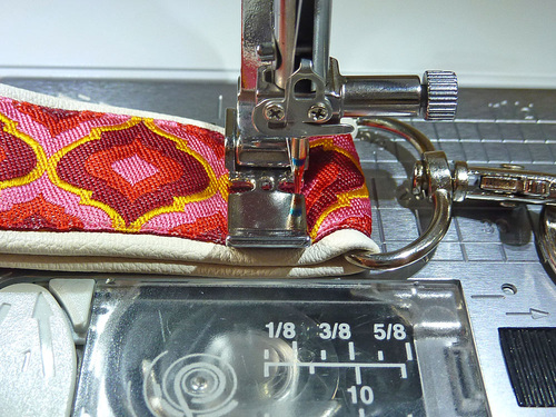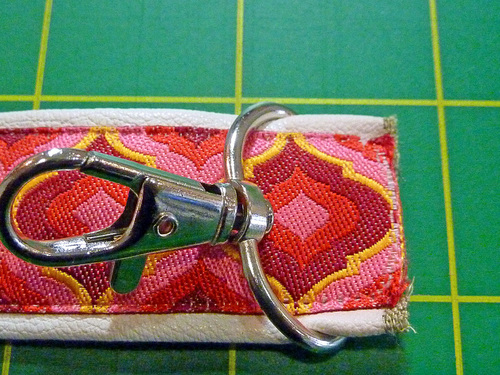 - Stitch across the strip, running the seam as close to the base of the swivel hook as possible. This keeps the hook from sliding around the loop.