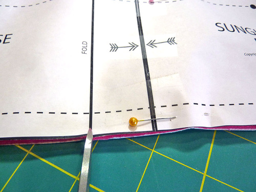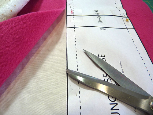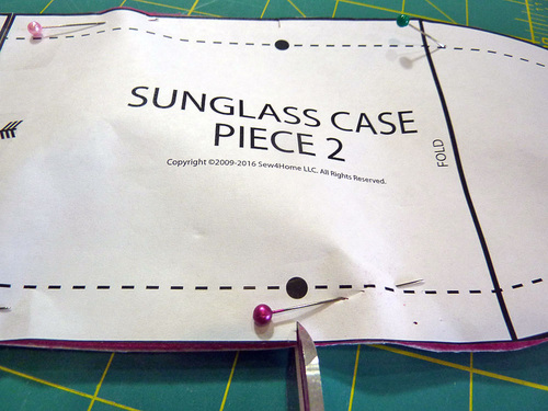 - Place the pattern on top of the layered fabrics and pin through the fleece layer, just catching the faux leather/vinyl underneath. Cut along the solid line through both layers.