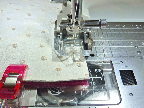 - Thread the machine with thread to best match the faux leather/vinyl. Lengthen the stitch.