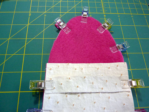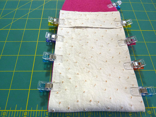 - Using your marks as a guide, fold up along the center fold line. Make sure your side edges are flush and the sewn edge is straight. Re-clip in place along both sides. The top clips around the curved flap end remain as-is.