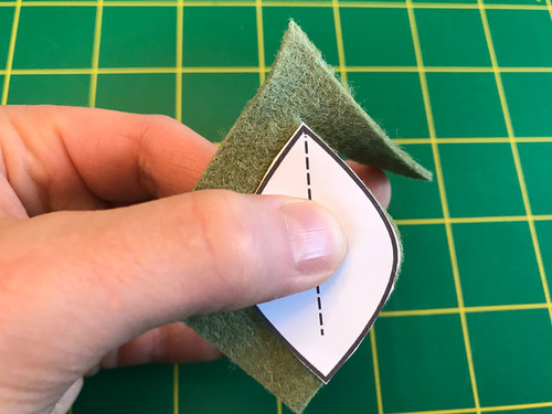 - Re-thread the machine with the darker green thread in the top and bobbin. Switch to a standard presser foot if need be. Keep a slightly lengthened stitch. Stitch through the center of each leaf from the inner-most point to within about ¼” of the outer-most point.