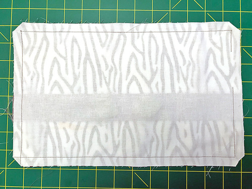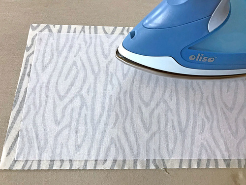 - Center the interfacing on the wrong side of both the exterior and lining panels. There should be ½” of fabric showing beyond the interfacing on all sides. Following manufacturer’s instructions, fuse in place.
