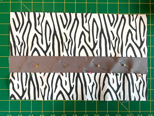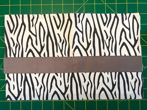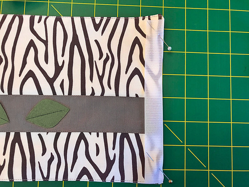 - Pin the ribbon in place on the exterior panel. The bottom edge of the ribbon should be 2½” up from the bottom raw edge of the fabric panel.