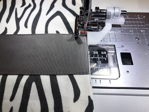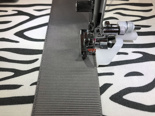 - Edgestitch the ribbon in place along both sides. We used our Janome Edge Guide foot to keep a precise seam very close to the edge.