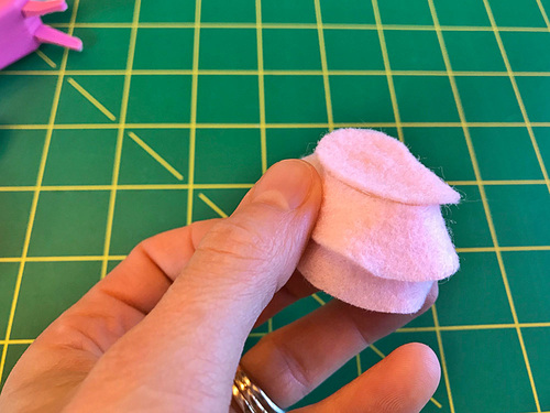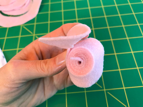 - Continue rolling, keeping the base even. You don’t need a super tight roll. A looser roll will allow the rose to flatten slightly and therefore sit better against the wrap.