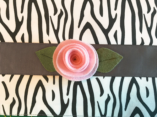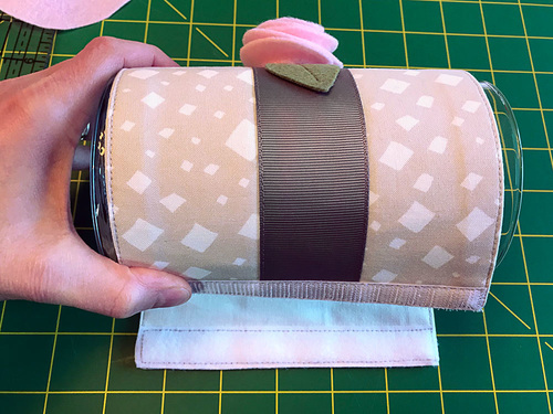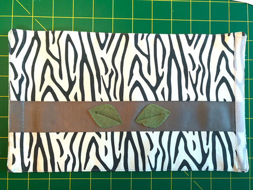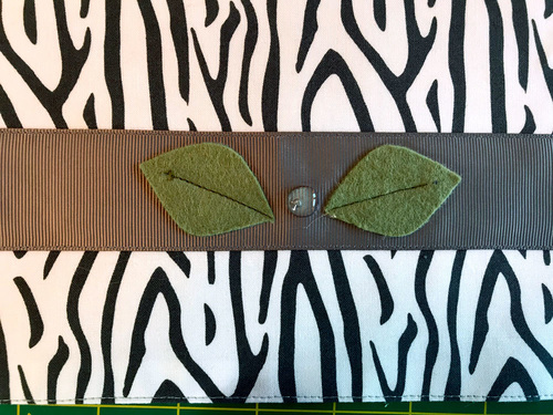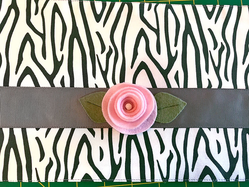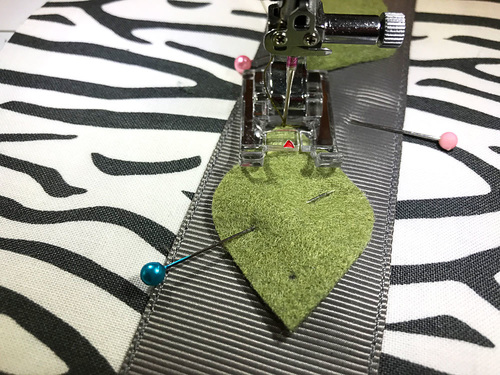 - You are stitching through the felt, the ribbon, and the interfaced exterior panel. Remember to lock your seam at each end. If you have a locking stitch on your machine, now is a good time to use it.