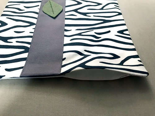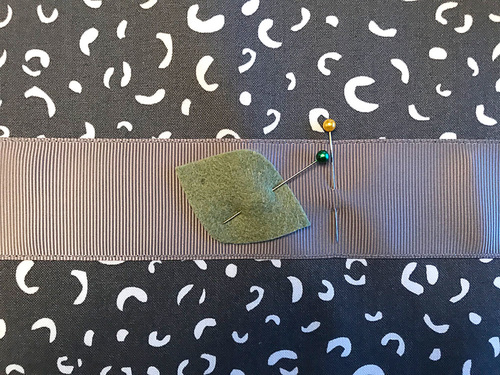 - Place the main exterior and the lining right sides together, sandwiching the ribbon and leaf(s) between the layers. All raw edges of both layers should be flush. Pin together, leaving a 2” – 3” opening along the upper right side.