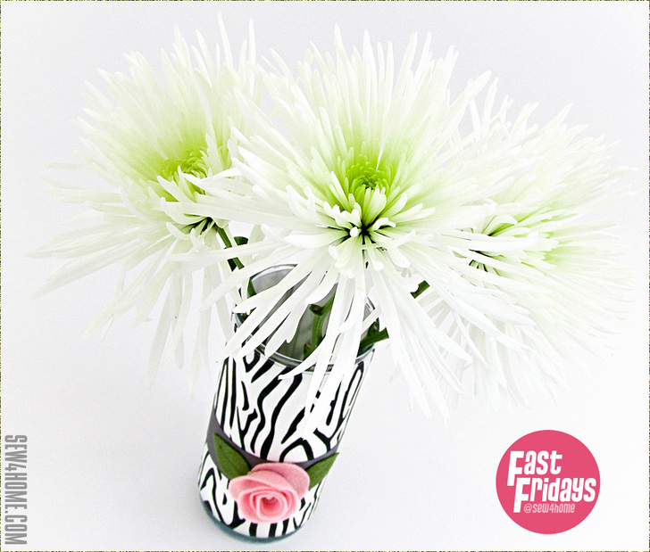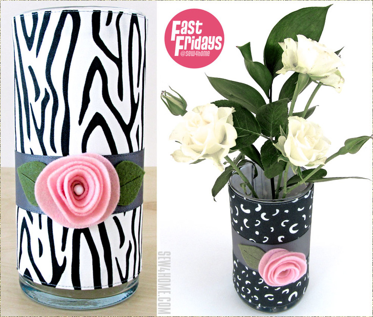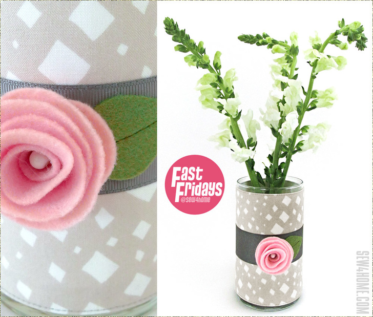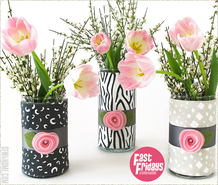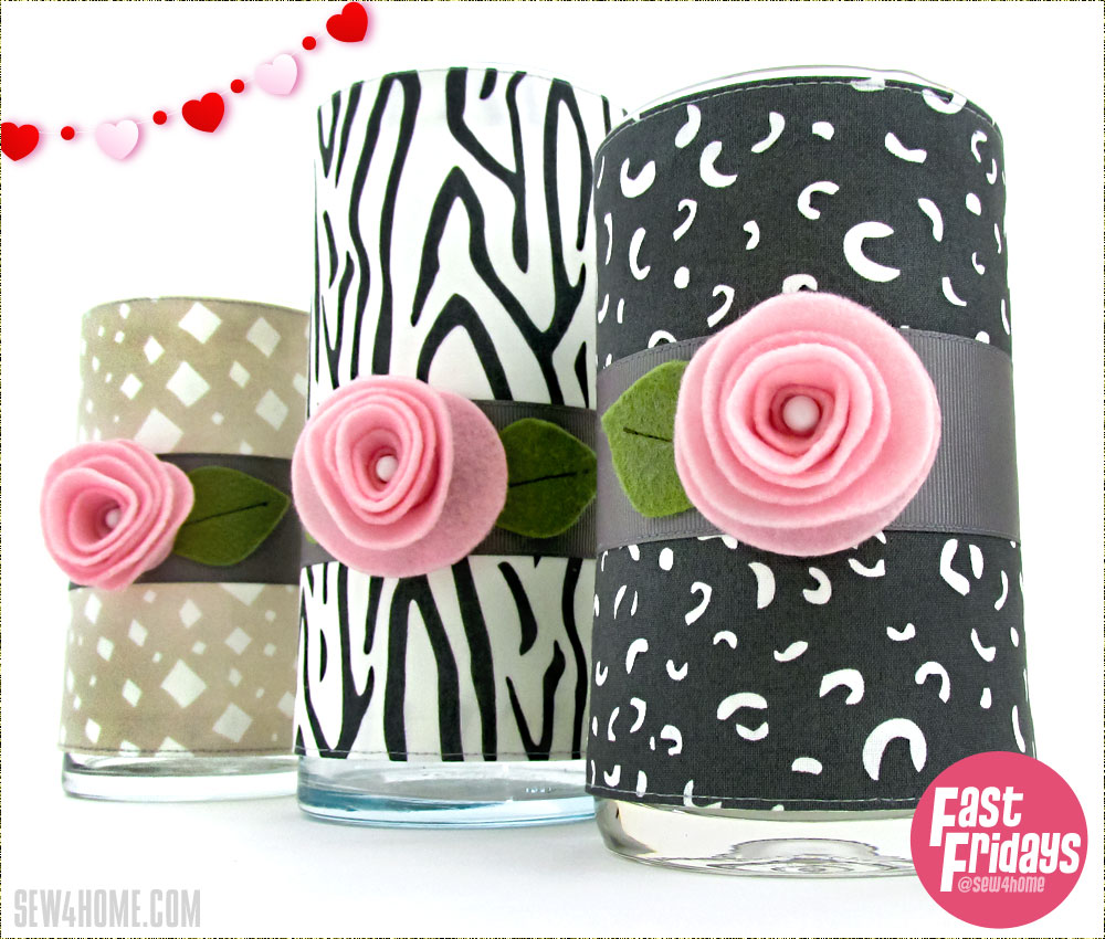 Clear glass vases… we all seem to end up with a cupboard full of them in various sizes. They can be quite lovely individually, but it can be difficult to use them in a grouping. In addition, because they are clear, you can see through to the floral arrangement’s stems and leaves, which may not be as pretty as you’d like! We have an easy answer: vase wraps. This is a Fast Fridays tutorial, so you know it will be quick and easy. And, even better, you’ll use just small cuts of fabric, interfacing, lining, and felt; also making it an excellent ScrapBusters project.