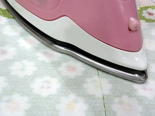 - Find the two fabric panels. Place each panel wrong side up on your ironing board.