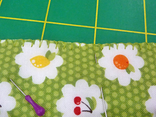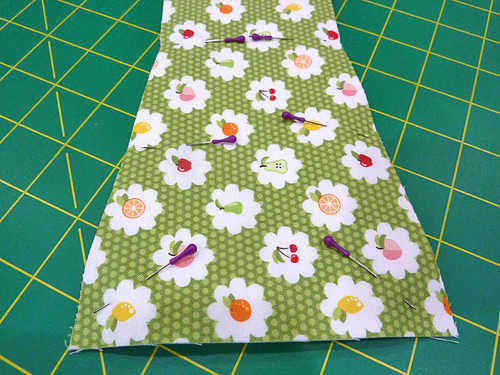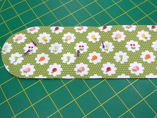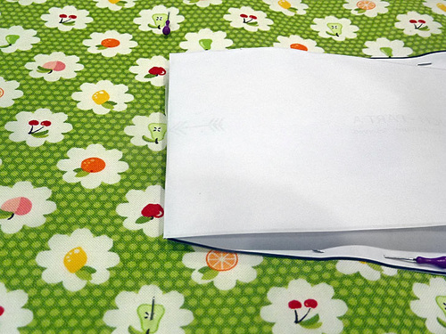 - Place the fabric “exterior” side up. The exterior is the fabric layer that will face out when the pocket is folded up into position (the cute little fruits on our sample). Make sure the marks delineating the crack are visible.