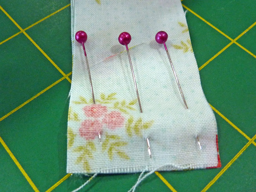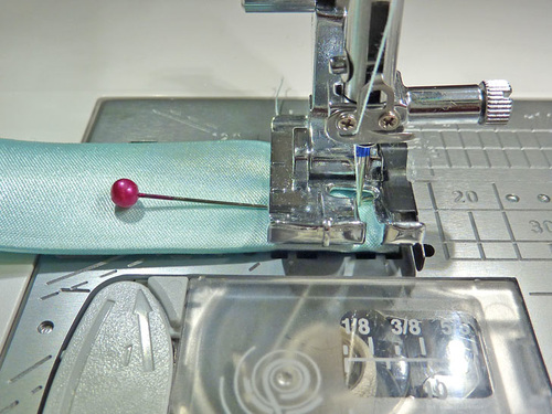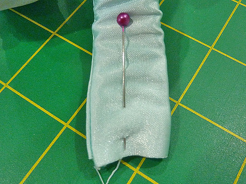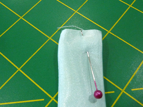 - Find the 2½” silk/satin strip. Fold it in half, right sides together, and pin.