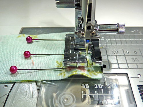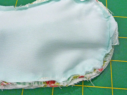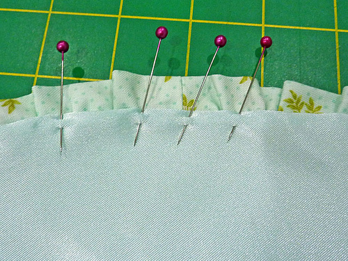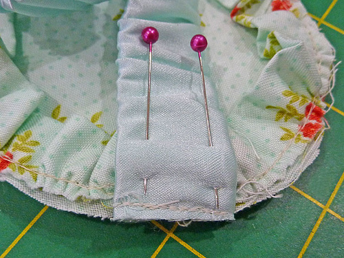 - Fill in all around with pins so the ruffle sits flat against the mask. Don’t be afraid to use plenty of pins.