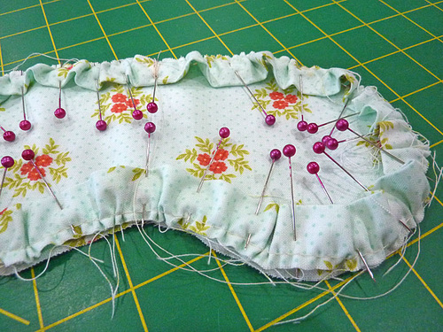 - Pull the gathering threads to fit the ruffle to the mask front. We recommend fitting one side first (pin-point to pin-point) and then fitting the opposite side.