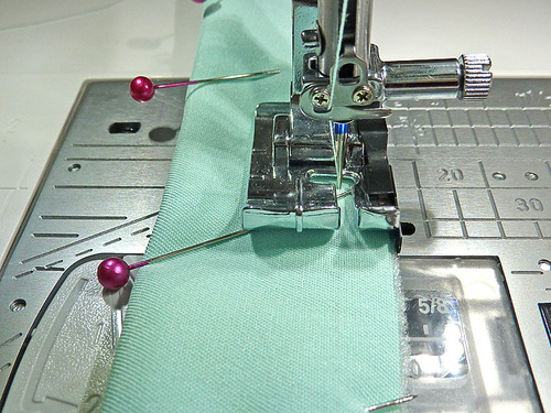 - Just as you did on the first end, pin the elastic in place through both layers then edgestitch in place.