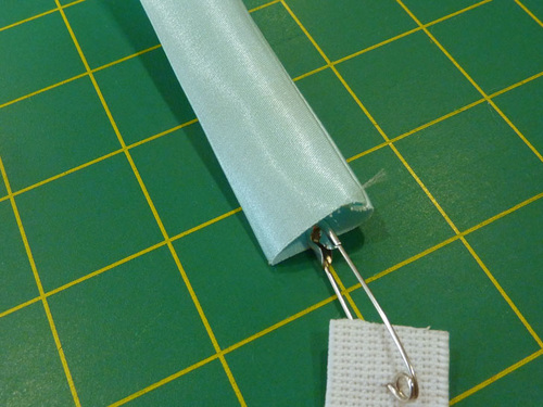NOTE: We recommend using a pressing cloth when working with silk/satin. - Find the elastic. Attach a large safety pin to one end.