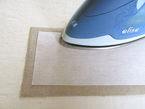 - Center the interfacing rectangle on the wrong side of the front fabric rectangle so there is ½” of fabric extending beyond the interfacing on all sides. Following manufacturer’s instructions, fuse in place.