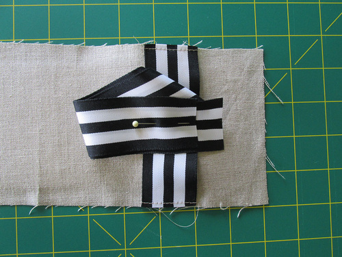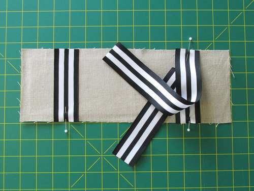 - Baste each ribbon in place, staying close to the raw edge of the fabric panel.